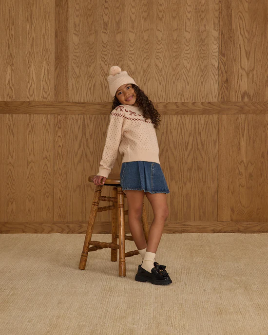 This Fair Isle Sweater is a cozy knit featuring a sweet bow motif and traditional fair isle patterning. Designed in a soft petal base with warm accents, it brings both comfort and charm to everyday wear.