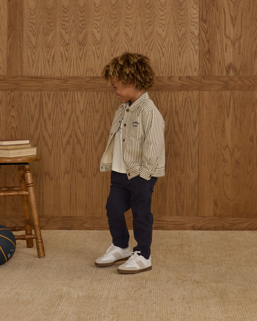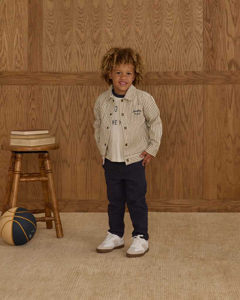 Featuring our 'navy pinstripe' print on our 'natural' denim.