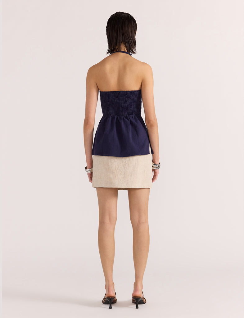 The Mira Halter Top in navy from Staple the Label is crafted with a breathable, durable and eco-friendly Ramie and Cotton blend fabrication. This halter top is ruched at the sides to flatter the waist and make you feel your best, and an elasticated back to ensure the perfect fit to your body.