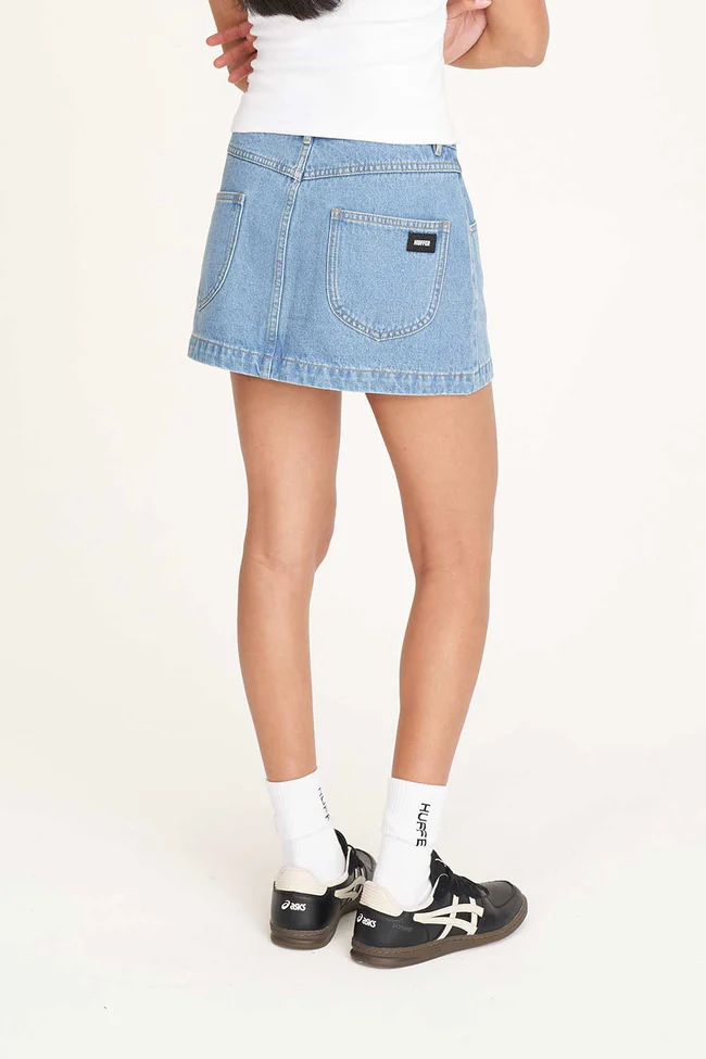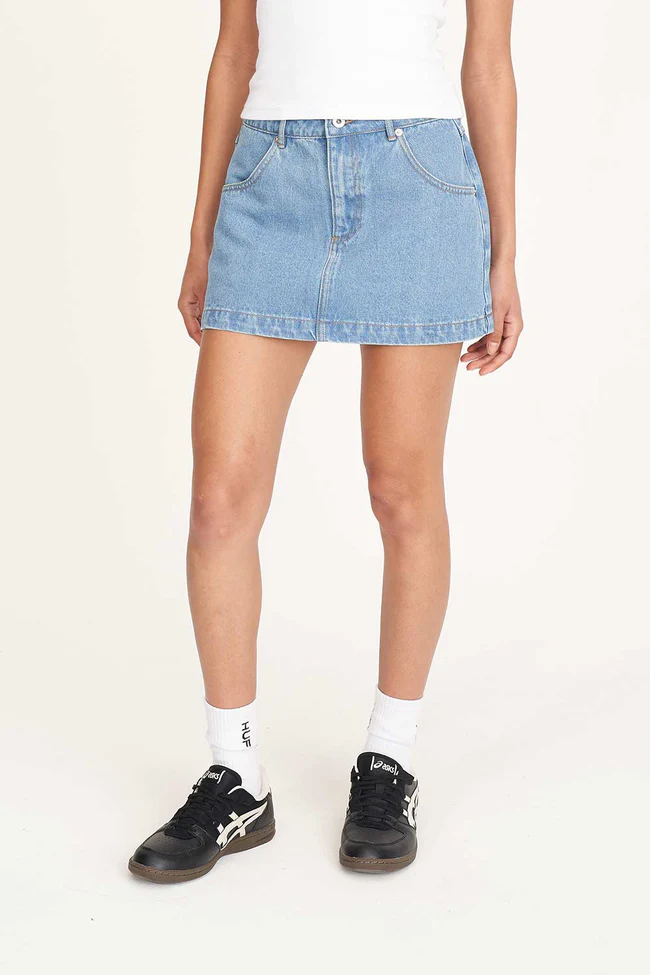 • What you need to know: 100% Cotton, 12oz Huffer custom denim, fixed waistband, mini skirt length, fly and shank button closure with Huffer branded woven label
