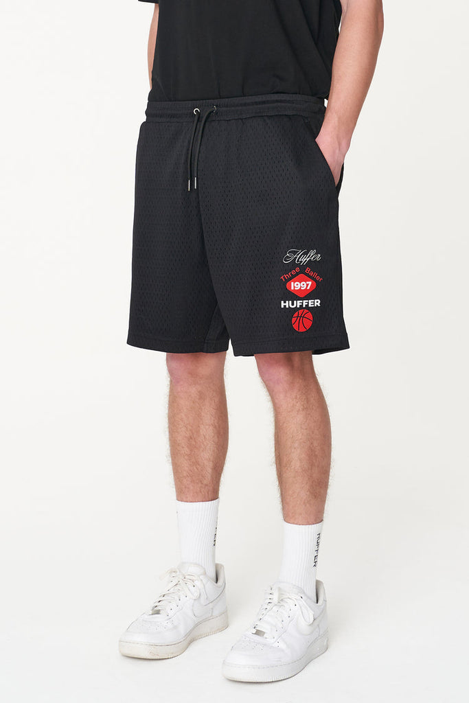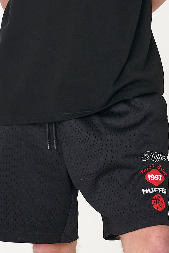 Keep your game tight with these black basketball shorts. Crafted from breathable 100% polyester mesh and featuring a boxy fit, elasticated waistband with drawcord, and stripe tape detailing, you'll stay cool and comfortable on the court! Plus, you'll look baller with the Huffer branded hardware and placement print.