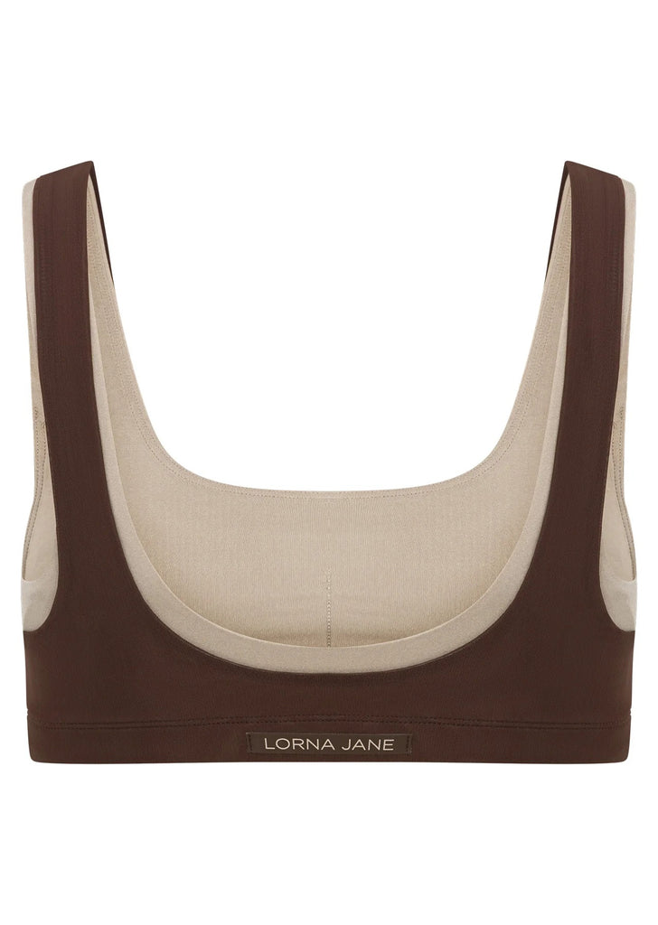 Find all day support and comfort in the too cute to cover double down sports bra. Engineered in our sweat wicking LJ Elite fabric with a fashion forward mesh overlay design, this form flattering sports bra is perfect for Pilates, yoga, morning coffee catch-ups, and everything in between.