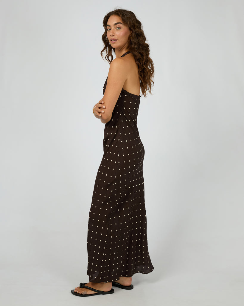 The Emelia Maxi Dress is a timeless statement, featuring a classic polka dot print and a flattering halter neckline with a softly gathered bust. Its V-neck silhouette flows into a graceful maxi length, finished with an invisible side zip for a seamless fit. Pair it with strappy heels or woven flats for effortlessly elegant spring styling.