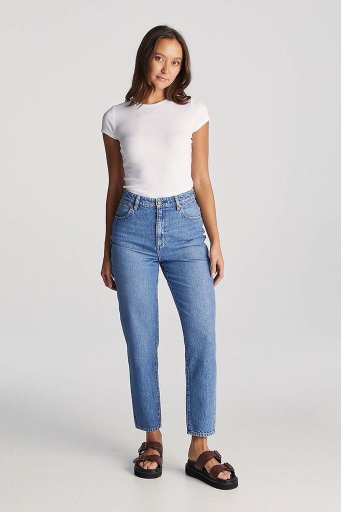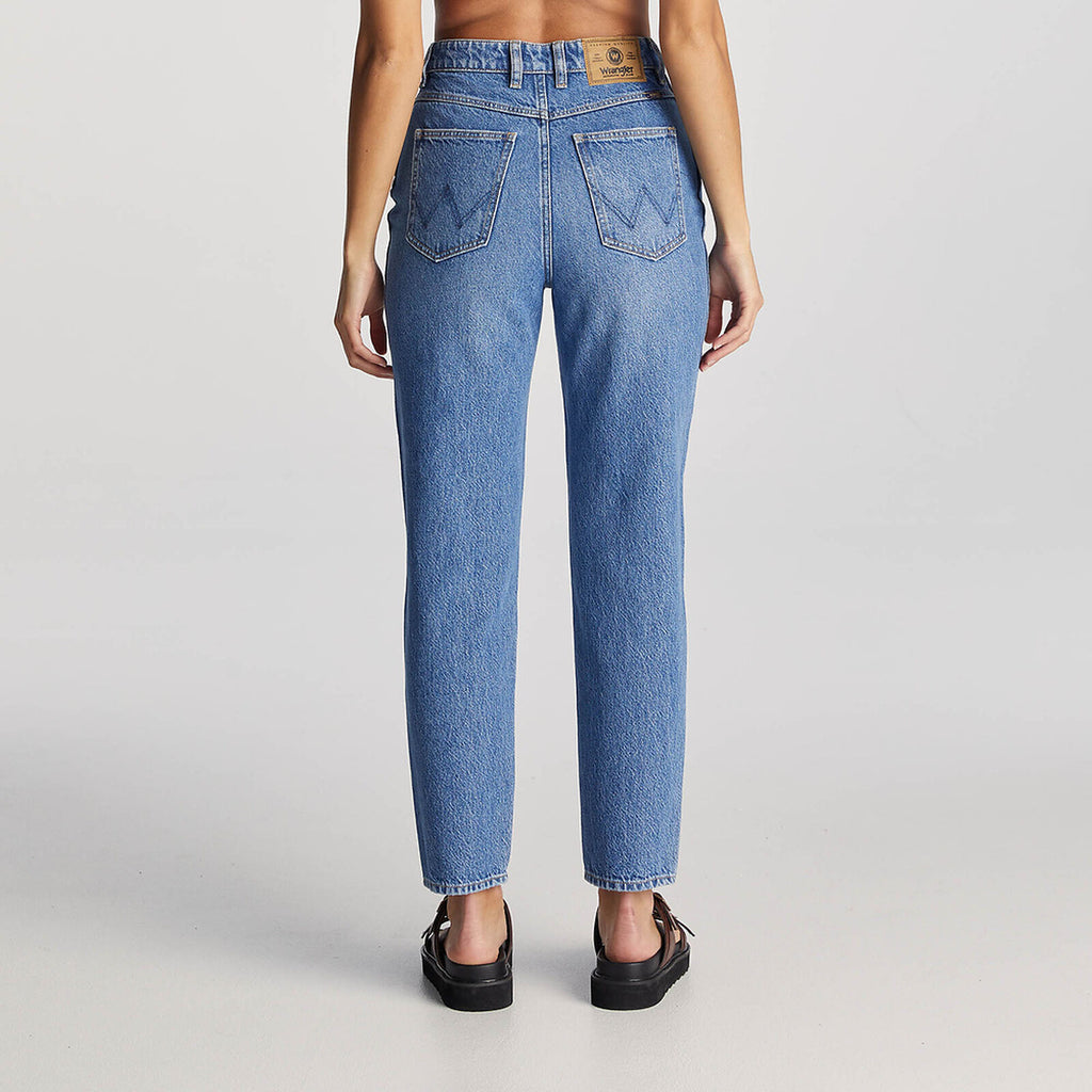 Hi Drew is Wrangler's Mom fit, sitting super high on the waist, with a slim leg that tapers to the hem. She has a slightly cropped length that hits just above the ankle. Designed to be worn fitted, this jean will soften and shape to the body with wear, for a flattering and effortless look. Made in a mid-indigo wash.