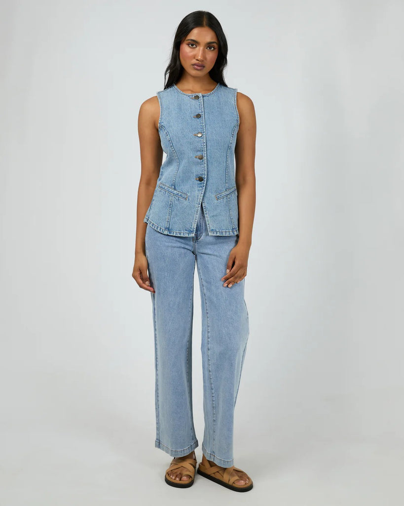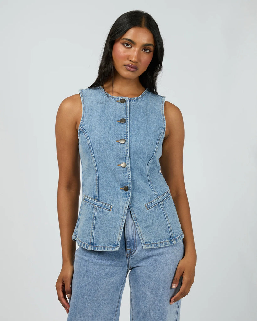 The Lena Denim Vest features a classic button-down front and a stylish split hemline at the torso, offering both comfort and a flattering fit. This versatile piece is perfect for layering, adding a timeless touch to your casual wardrobe while allowing ease of movement throughout your day.