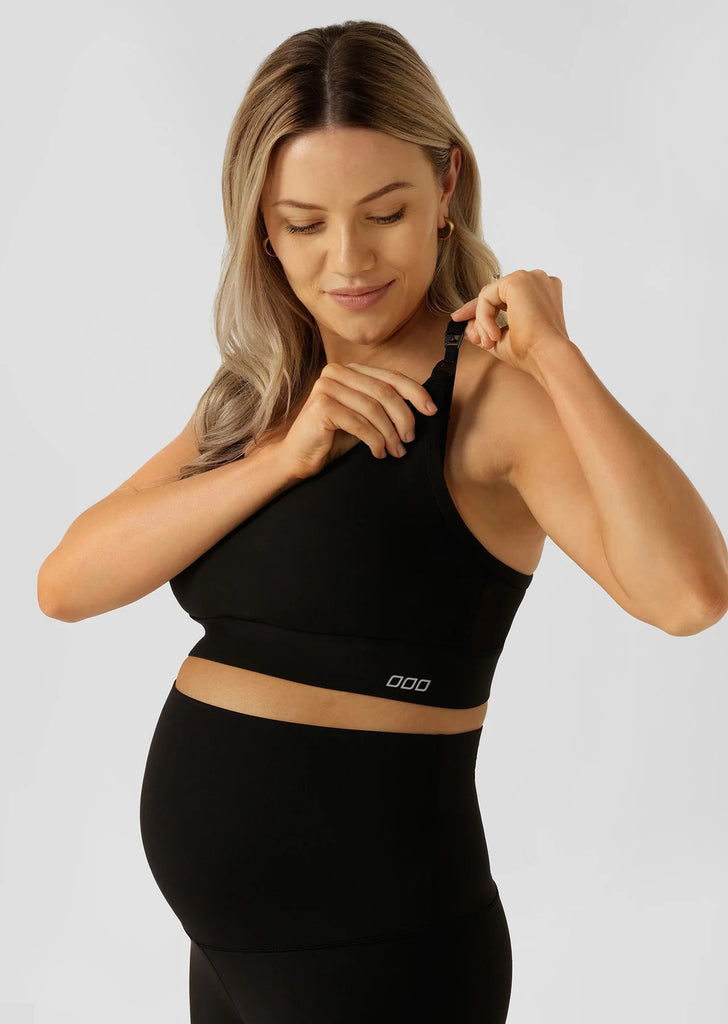 This maximum support nursing sports bra will be your go-to post pregnancy must have! The extendable bra clasp allows you to completely customise your fit while the feeding clip and in built sling allows you to feed pre or post workout without compromising on support or comfort.