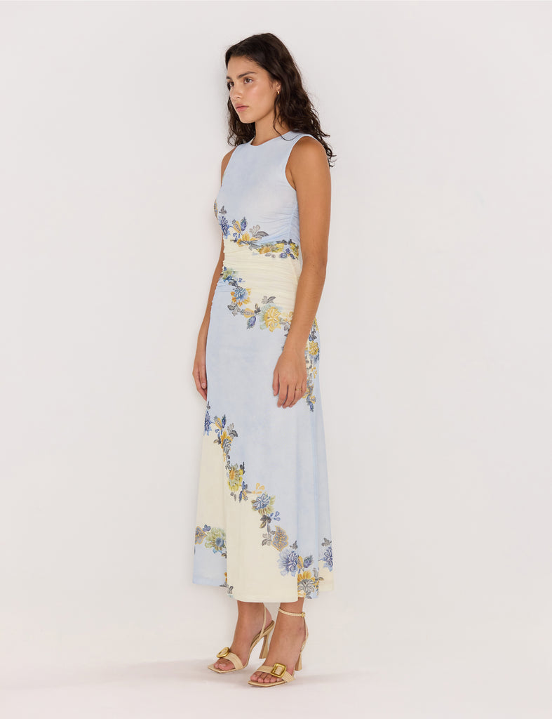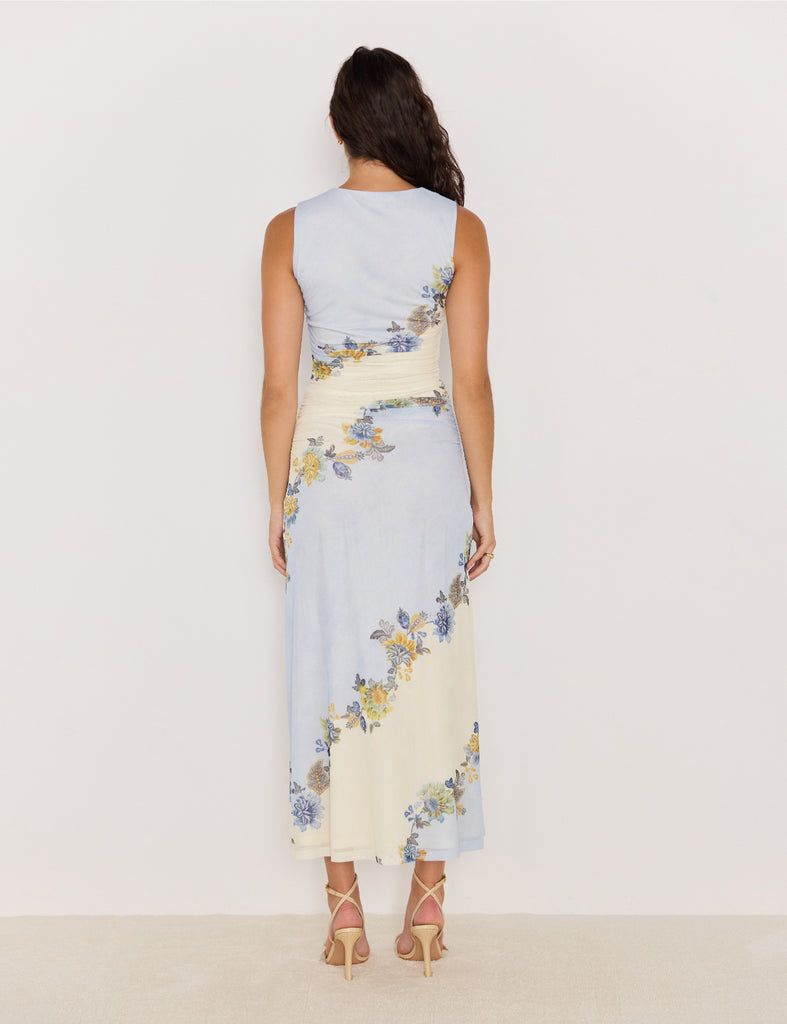 The Lucia Blue & Cream Floral Mesh Maxi Dress is a romantic, figure-skimming style that flows effortlessly from day to night. Crafted from soft stretch mesh, it features a dreamy watercolour blue and cream base with delicate floral accents in golden yellow and cornflower blue. The sleeveless design and subtle ruching enhance the silhouette, while the fully lined finish ensures comfort and coverage.