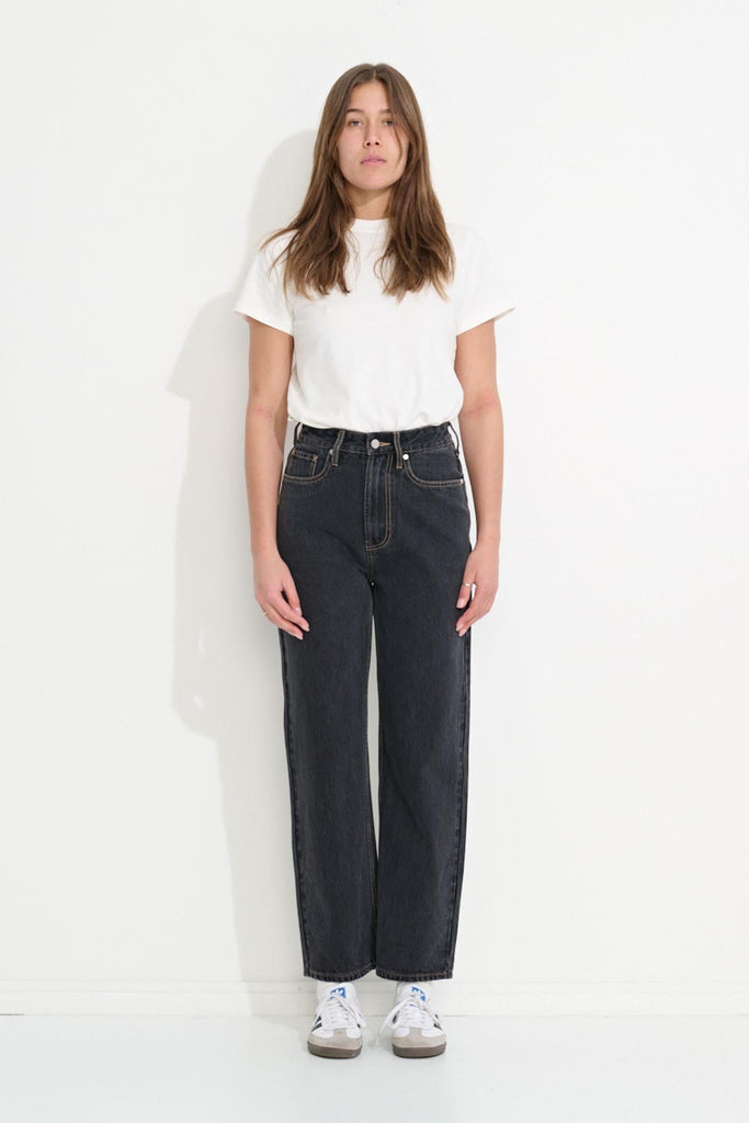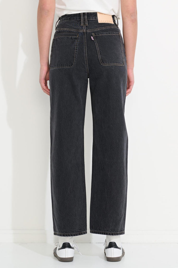 The Misfit Makers Women's Straight Jean in Pepper has a workwear inspired green town with a soft rinse wash. Using sustainably sourced premium yarn dye denim. High waisted and falling straight down the leg. Features a fixed waist, functional fly & belt loops like a classic 5 pocket jean but with a signature mismatched back pocket detail. " Misfit Makers" Vegan leather patch marks the back of the jean. Constructed from 12oz, 100% cotton yarn dye denim. Hand wash cold. Do not bleach. Do not tumble dry. Iron on reverse. Gentle dry clean.