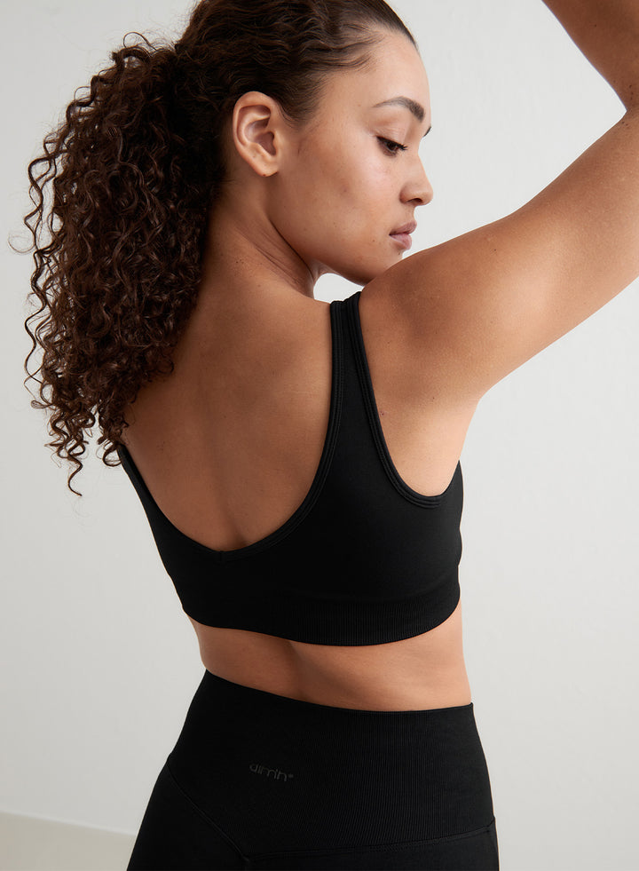 Shape Seamless Deep Cut Bra is made from our soft and stretchy Shape Seamless fabric. The sports bra has a deep cut front and back and ribbed details at front for a contouring effect. The sports bra features light support and has a tonal aim’n-logo at front. Match Shape Seamless Deep Cut Bra with Shape bottoms to create a matching set.