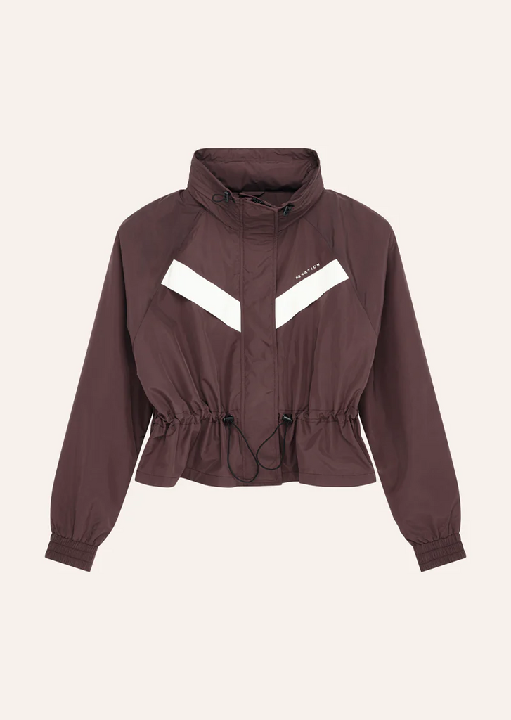 The Shelter Jacket is designed in our signature water resistant spray fabric. This cropped jacket features contrast chevron panelling, a hidden chest pocket, an elasticated drawcord waist and a packable hood. Wear your jacket over activewear for an elevated athleisure look.