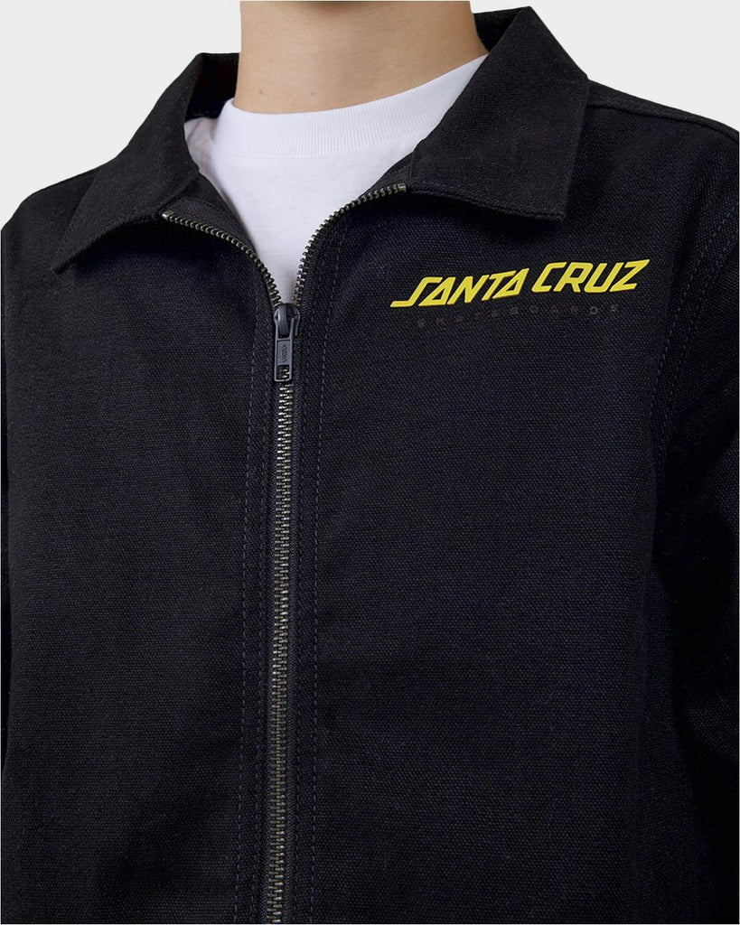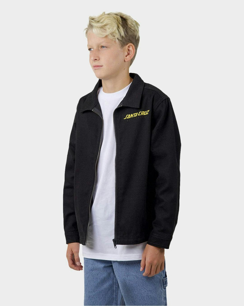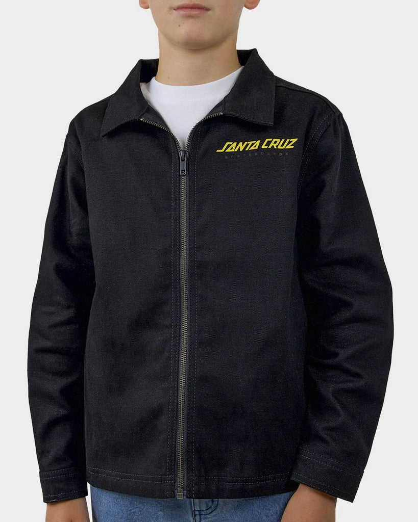 Boys Santa Cruz zip through worker jacket featuring a rubber print of the Snake Dot Strip artwork.